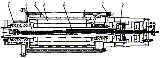 用于大型數(shù)控銑、加工中心的內(nèi)裝式電主軸單元(圖1)由主軸軸系1、內(nèi)裝式電機2、支承及其潤滑系統(tǒng)3、冷卻系統(tǒng)4、松拉刀系統(tǒng)5(用于數(shù)控車床的是卡盤、油缸對接法蘭)、軸承自動卸載系統(tǒng)6、編碼器安裝調(diào)整系統(tǒng)7組成。