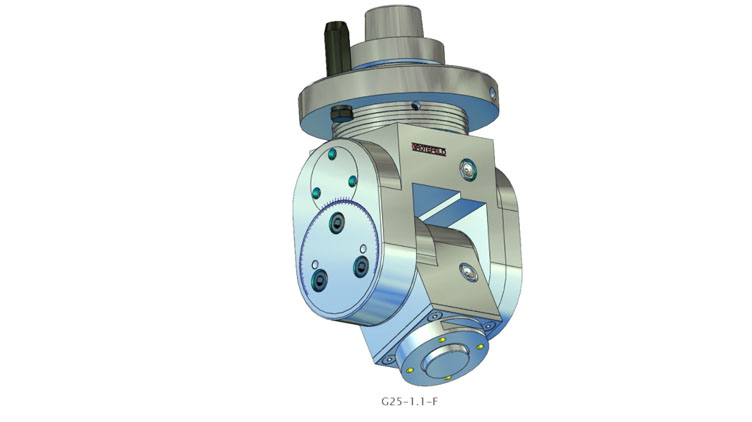 G25系列的角頭具有可根據(jù)刻度進行無級調(diào)整的加工主軸。設置范圍從 0°(垂直)擴展到兩側(cè)最大 100°。主軸的旋轉(zhuǎn)方向與驅(qū)動器的旋轉(zhuǎn)方向相反。