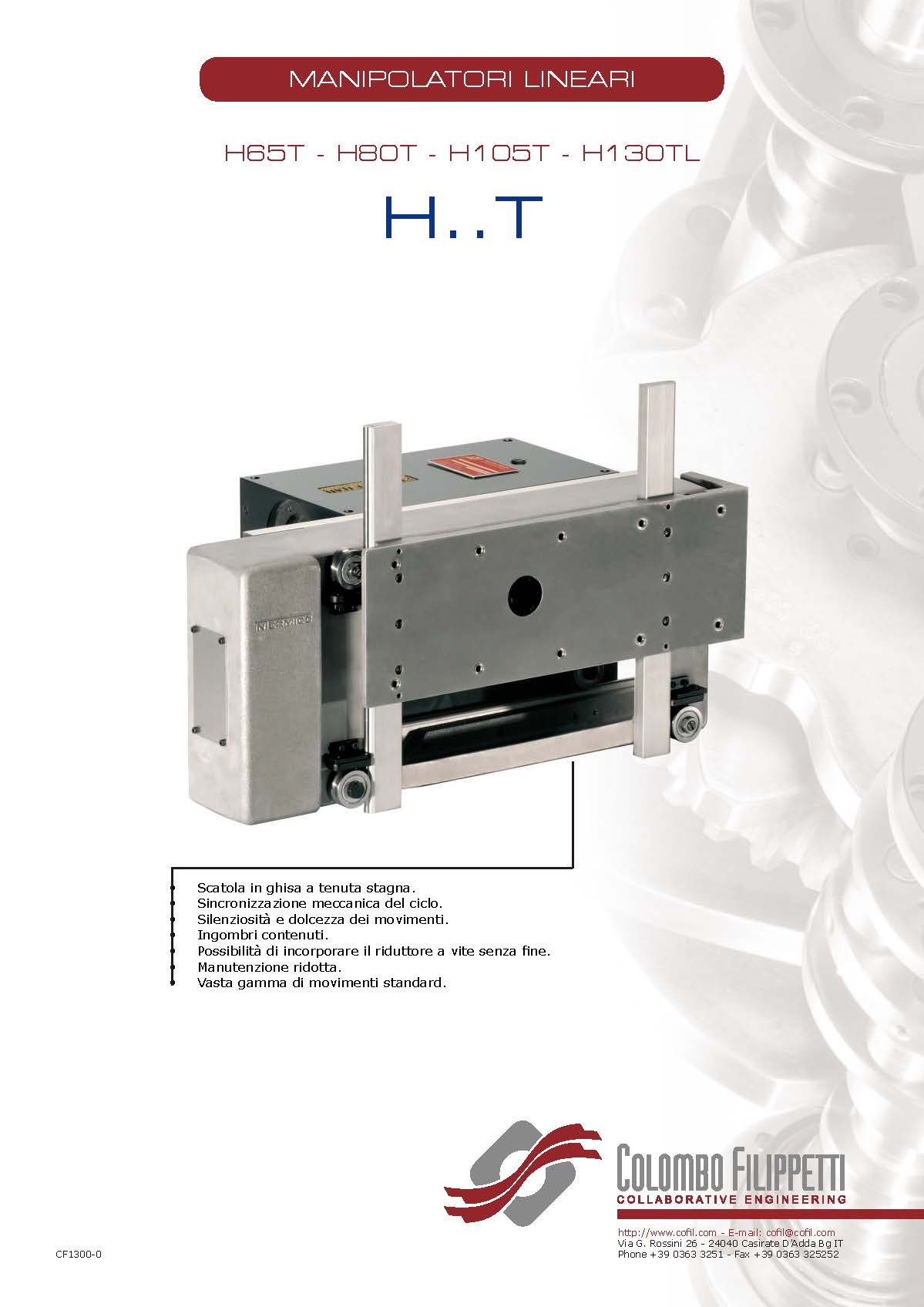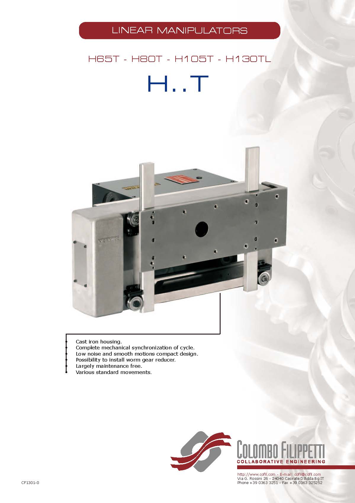 COLOMBO FILIPPETTI spa 的 H.. T 系列線性機械手是共軛雙凸輪機構,可將均勻的輸入旋轉運動轉換為典型的“門柱”拾放運動的同步相位 2 軸正交線性運動。